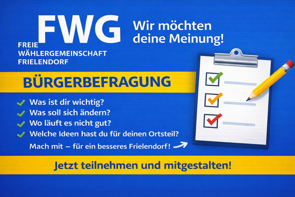 Als Freie Wählergemeinschaft hören wir nicht nur zu – wir handeln. Sag uns, was dich bewegt. Deine Meinung hilft uns, konkrete Lösungen für unsere Gemeinde zu entwickeln – gemeinsam mit dir.